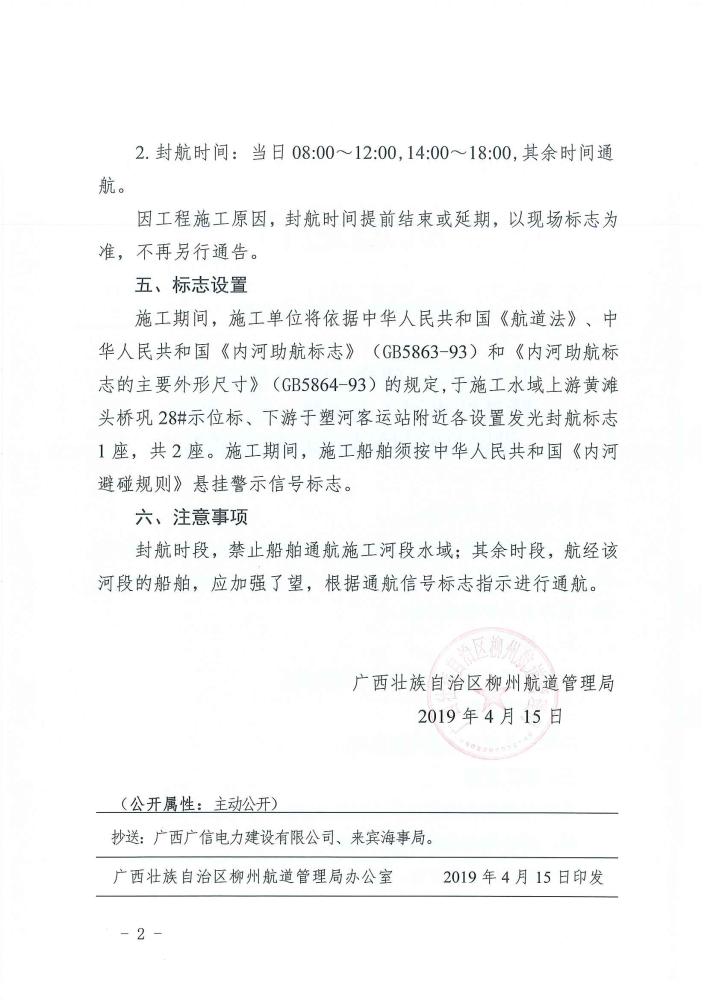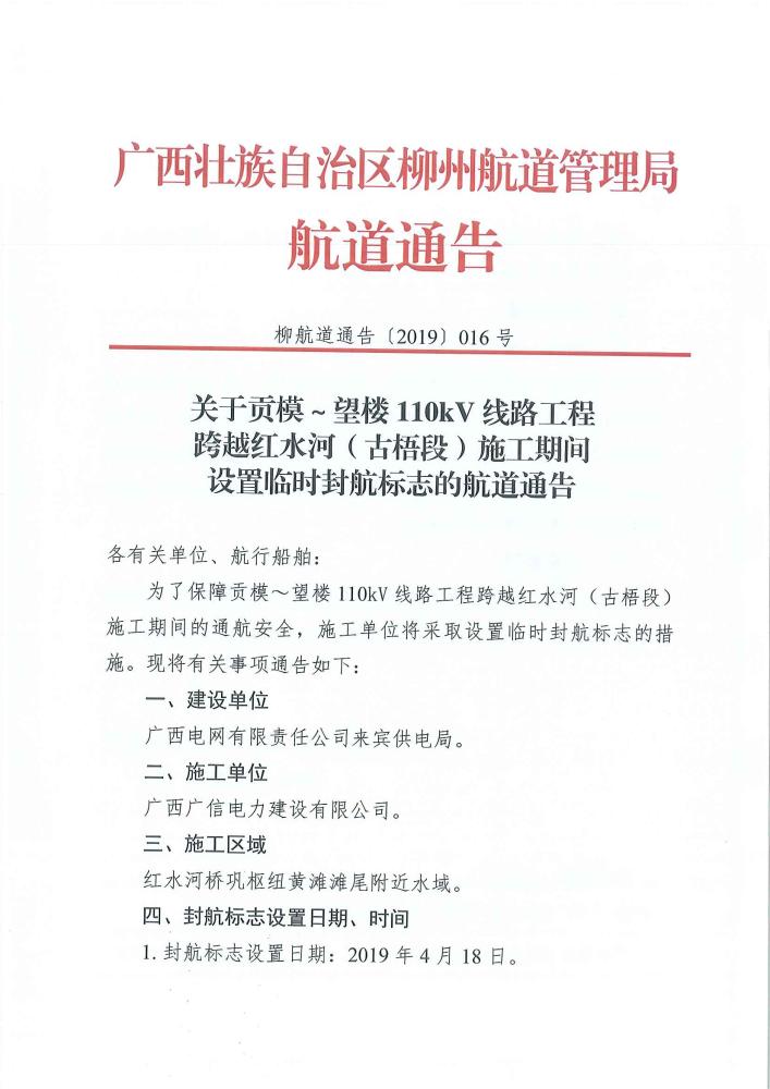 关于贡?!?10kV线路工程跨越红水河(古梧段)施工期间设置临时封航标志的航道通告