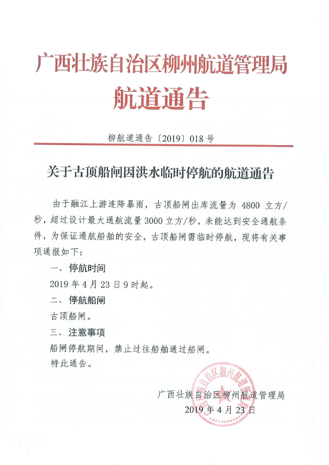 关于古顶船闸因洪水临时停航的航道通告