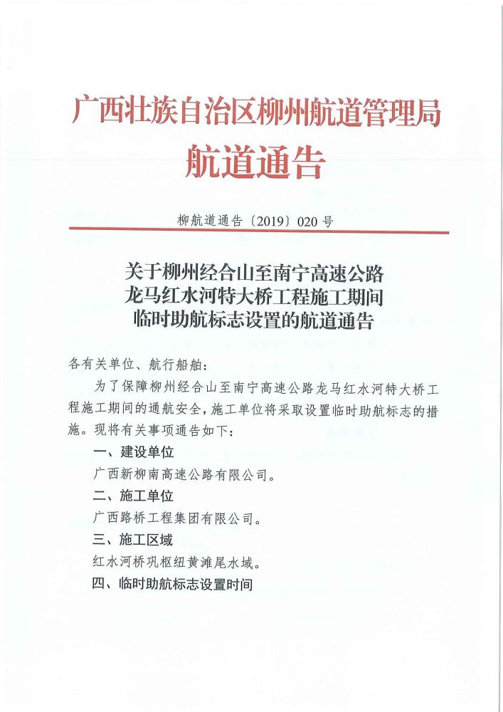 关于柳州经合山至南宁高速公路龙马红水河特大桥工程施工期间临时助航标志设置的航道通告