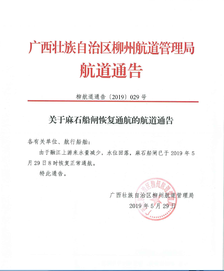 关于麻石船闸恢复通航的通告
