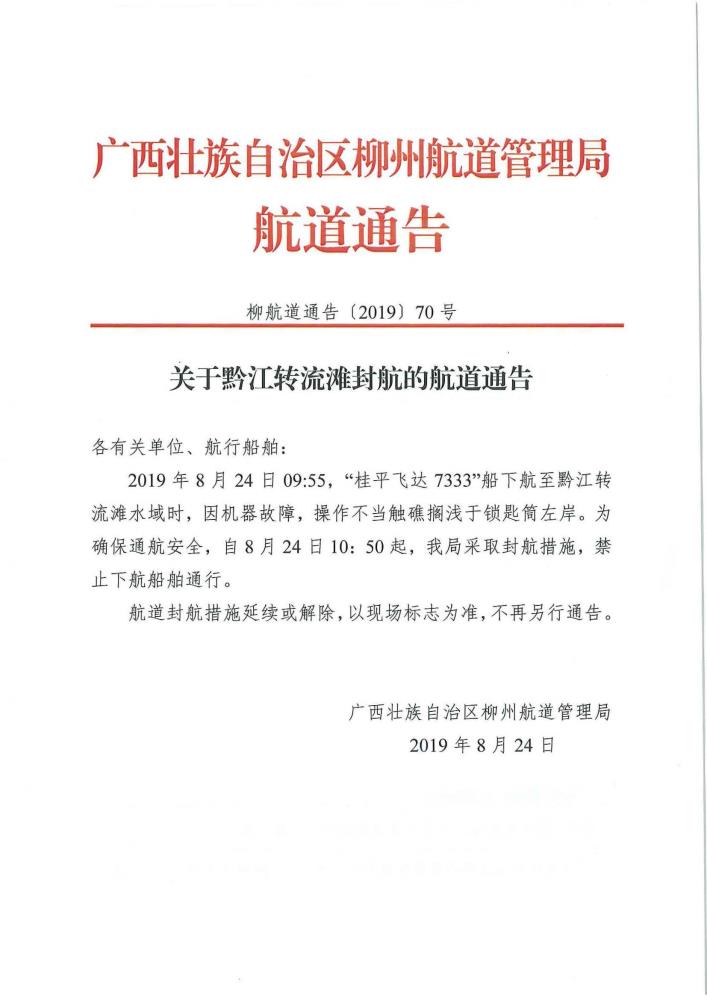 关于黔江转流滩封航的航道通告