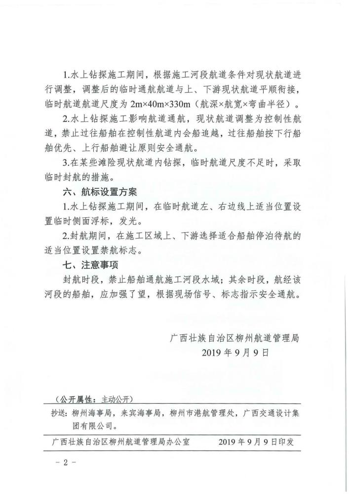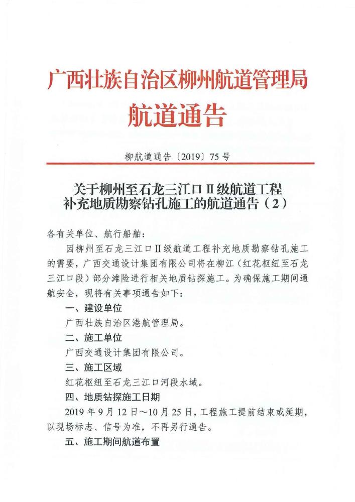 柳江柳州至石龙三江口Ⅱ级航道工程补充地质勘察钻孔施工的航道通告(2)