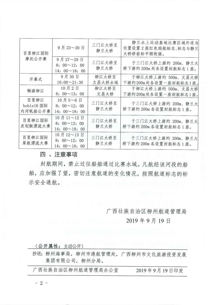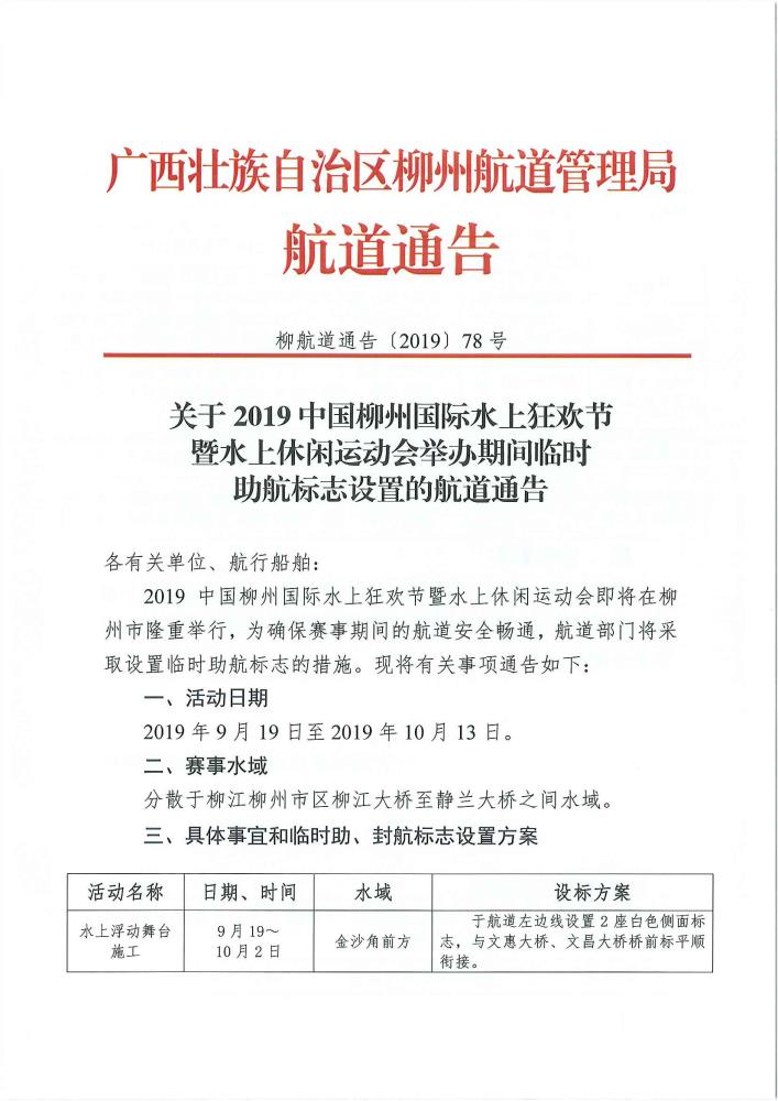 关于2019中国柳州国际水上狂欢节暨水上休闲运动会期间临时助航标志设置的航道通告