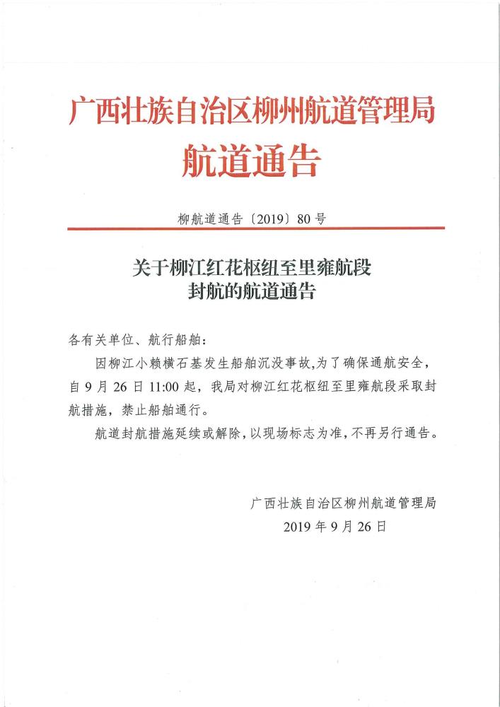关于柳江红花枢纽至里雍航段封航的航道通告