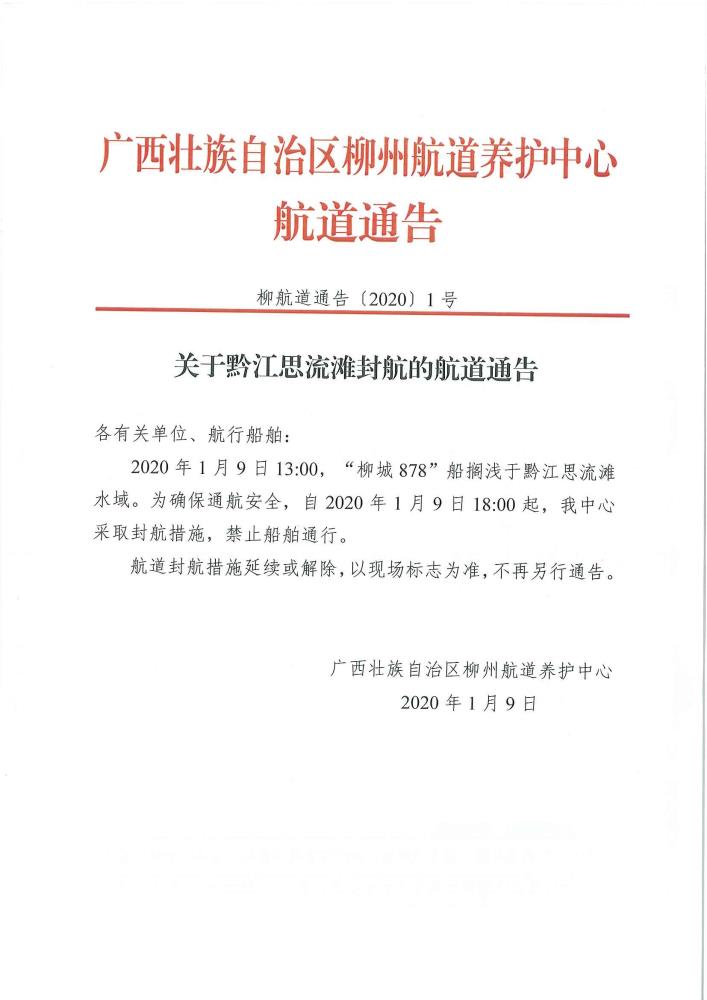 关于黔江思流滩封航的航道通告