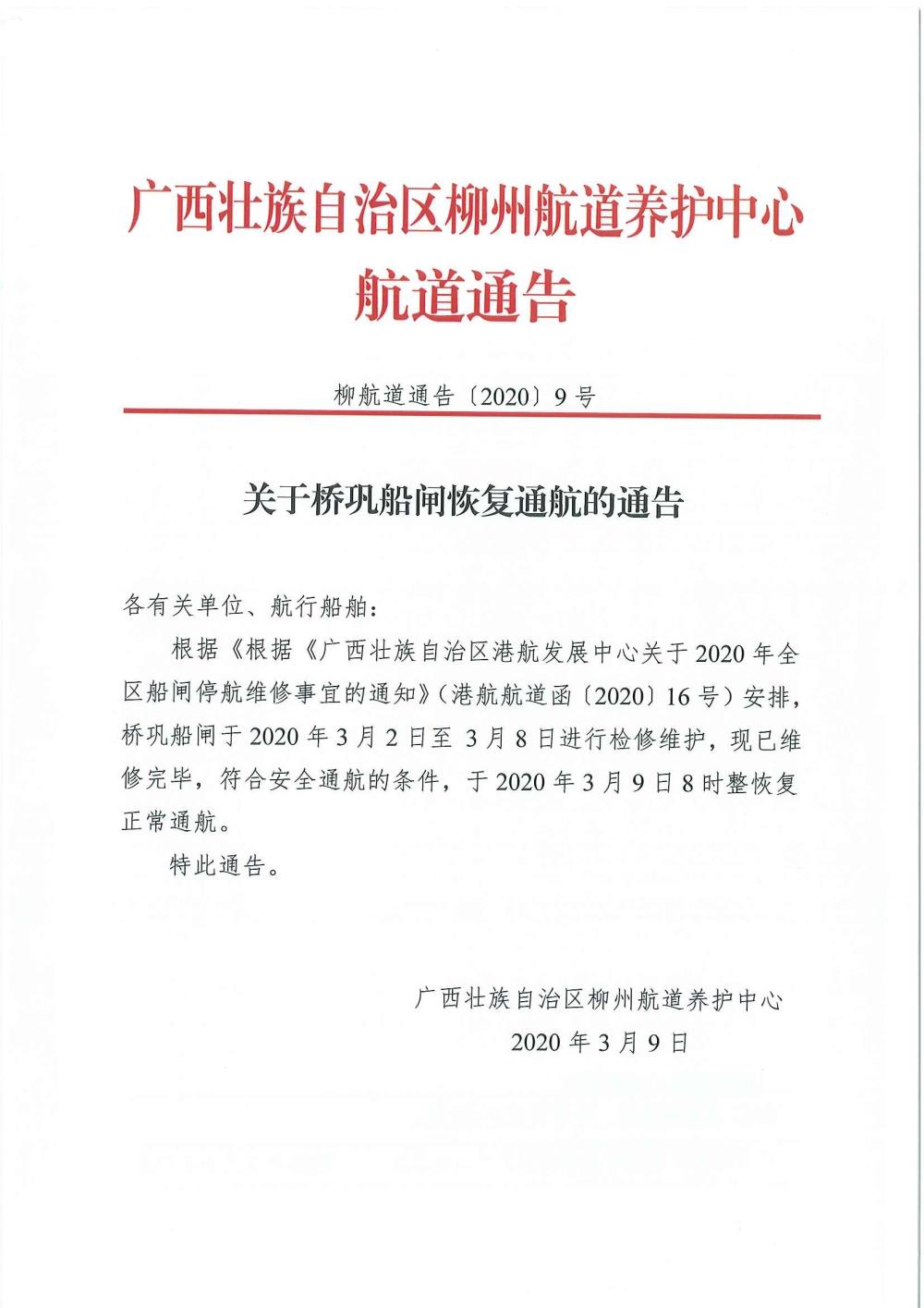关于桥巩船闸恢复通航的通告