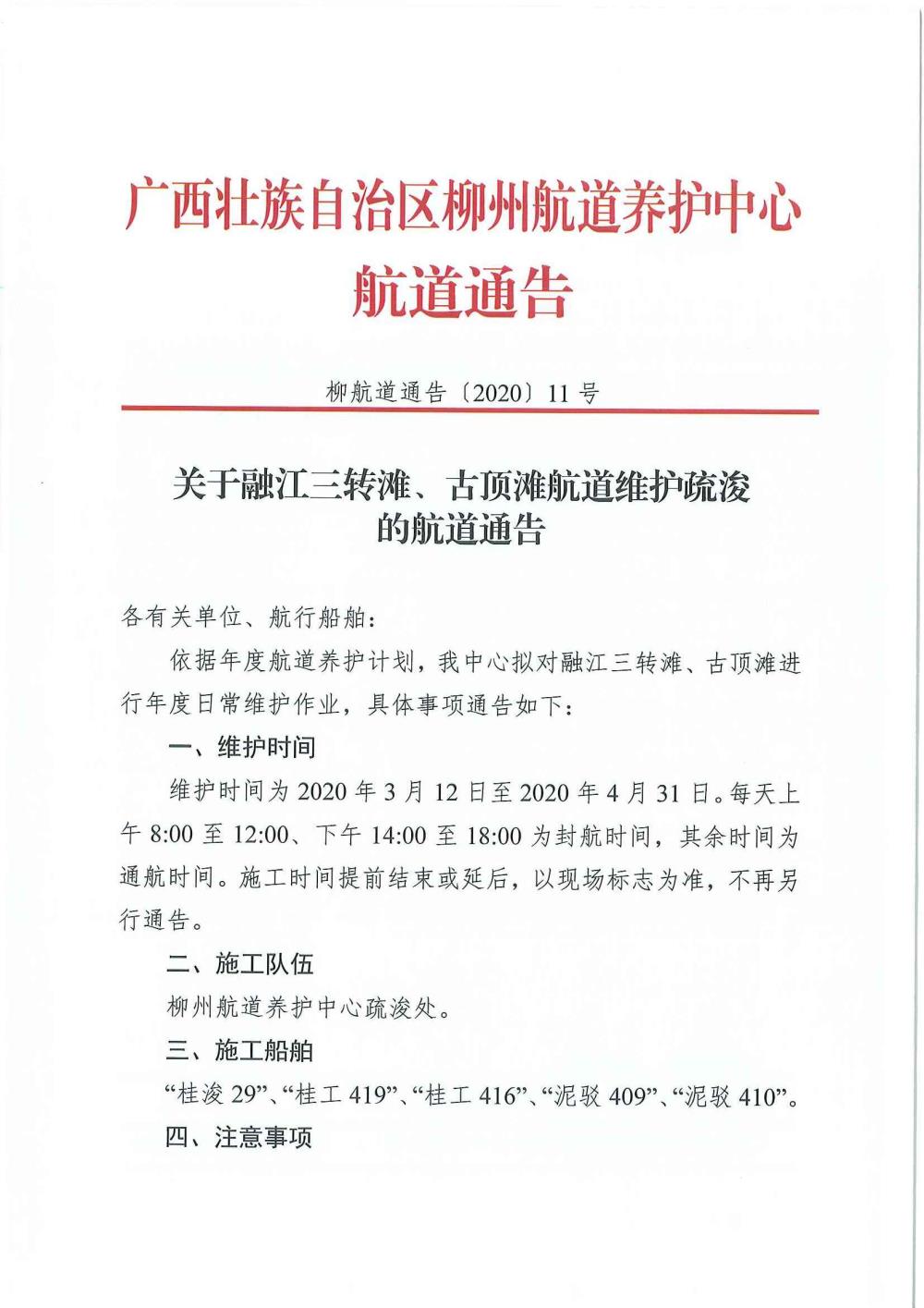 关于融江三转滩、古顶滩航道维护疏浚的航道通告