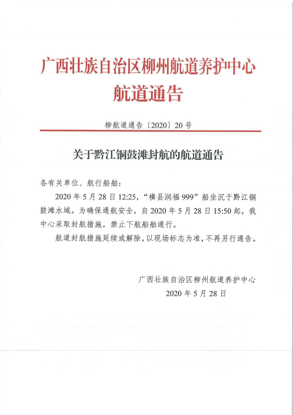 关于黔江铜鼓滩封航的航道通告