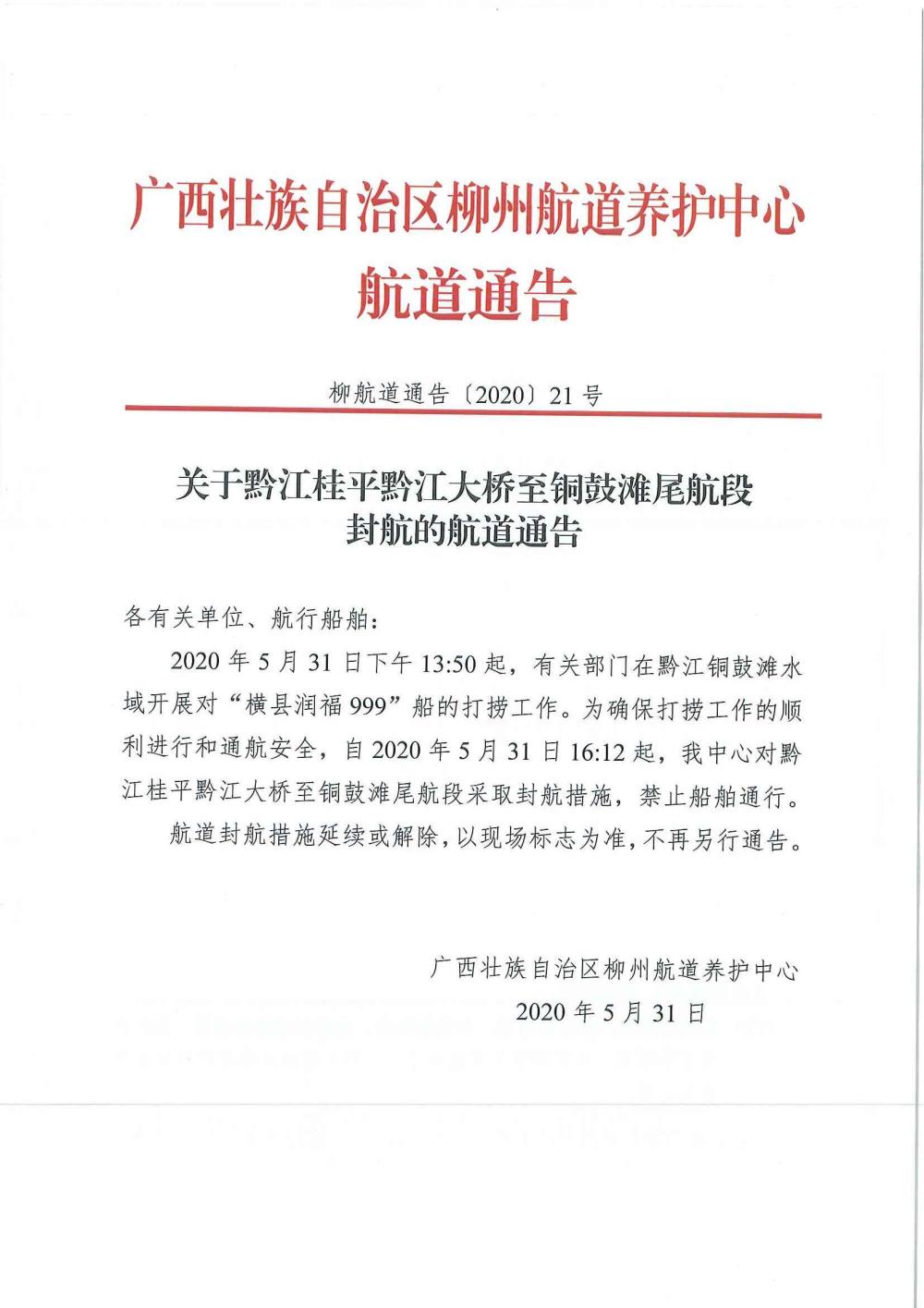 关于黔江桂平黔江大桥至铜鼓滩尾航段封航的航道通告