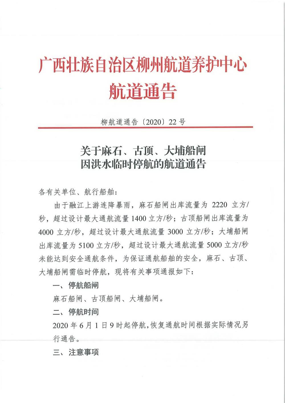 关于麻石、古顶、大埔船闸因洪水临时停航的航道通告