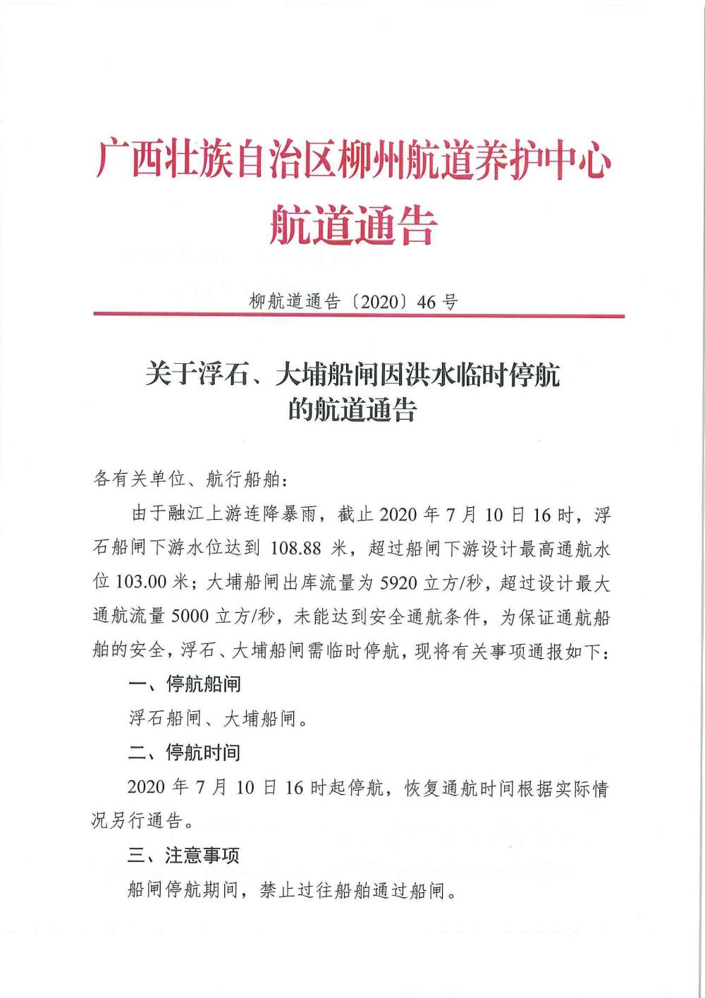 关于浮石、大埔船闸因洪水临时停航的航道通告