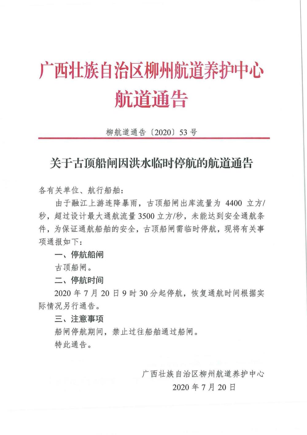 关于古顶船闸因洪水临时停航的航道通告