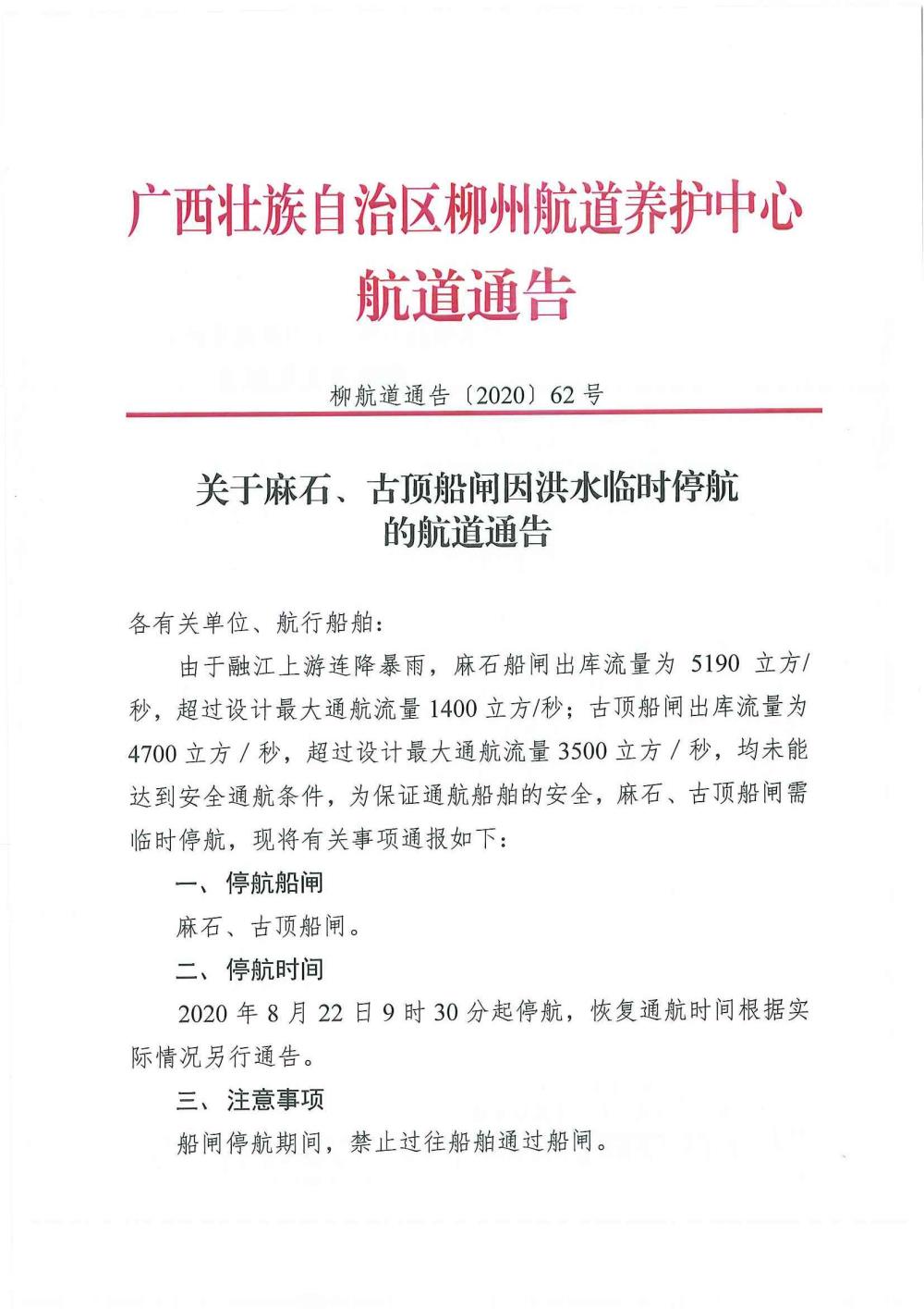关于麻石、古顶船闸因洪水临时停航的航道通告