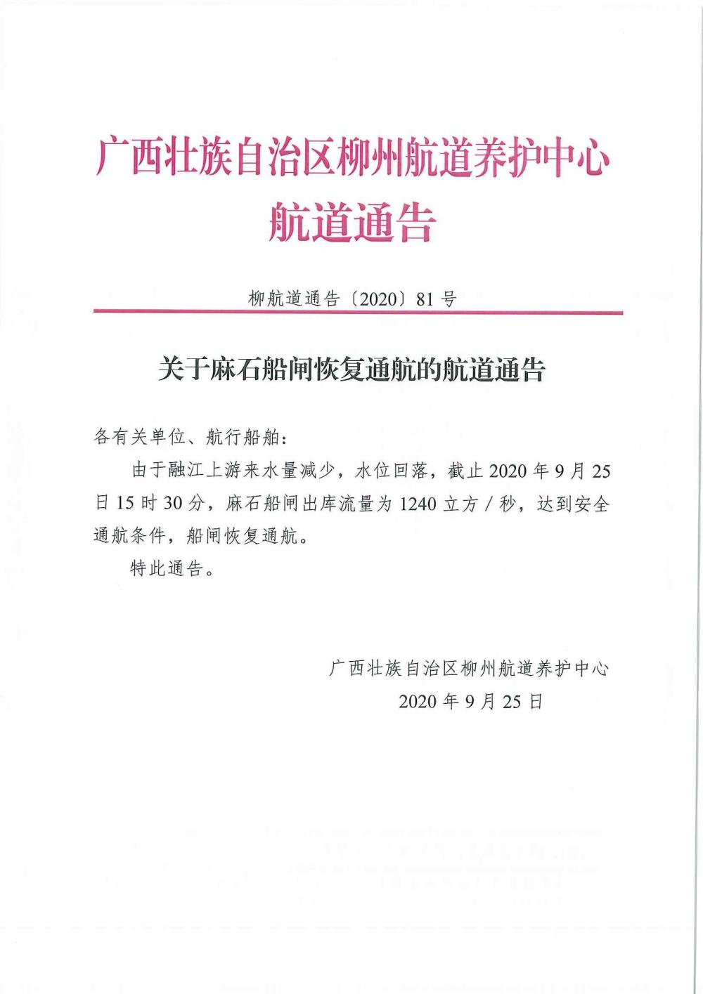 关于麻石船闸恢复通航的航道通告