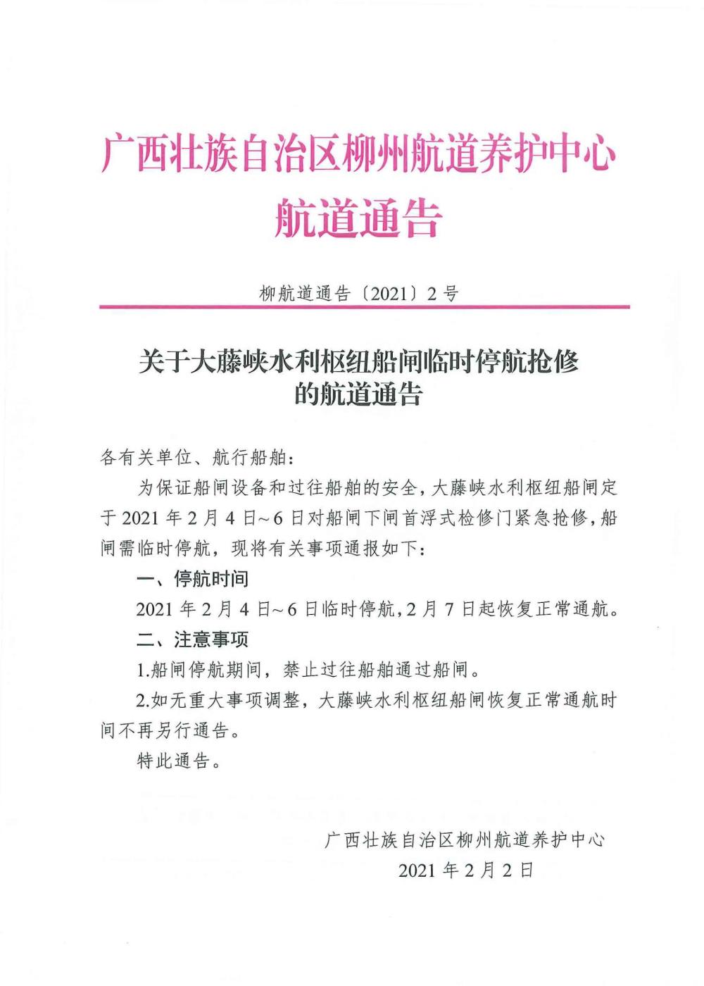 关于大藤峡水利枢纽船闸临时停航抢修的航道通告