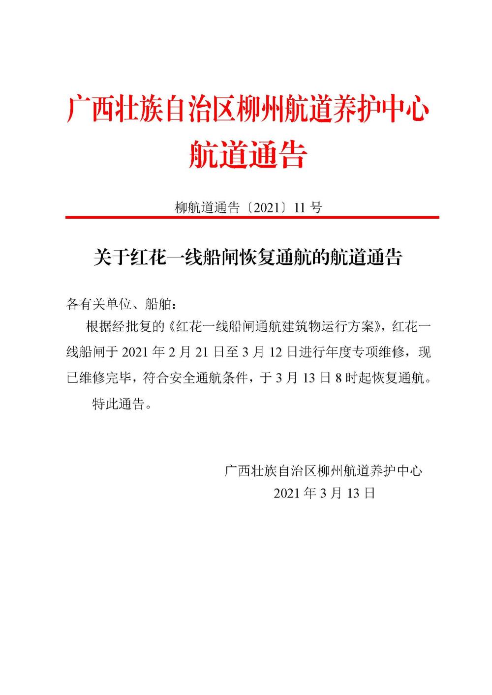 关于红花一线船闸恢复通航的航道通告