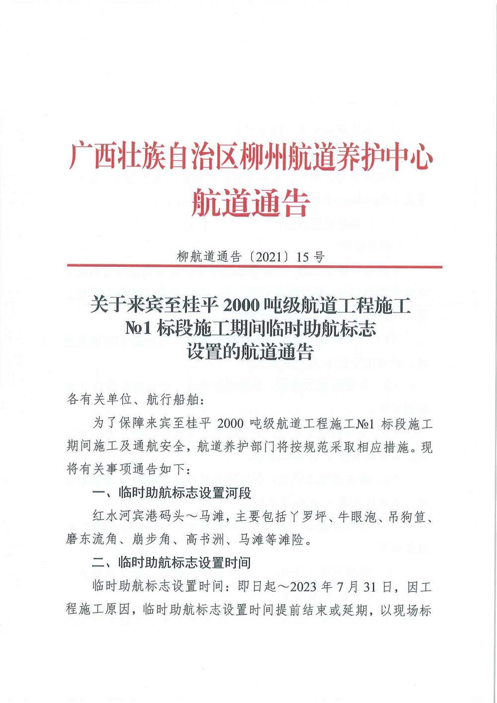 关于来宾至桂平2000吨级航道工程NO1标段施工期间专用标志设置的航道通告