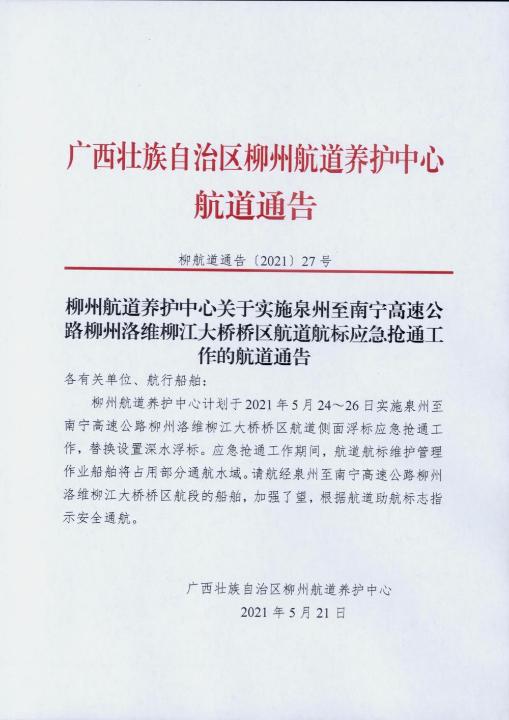 柳州航道养护中心关于实施泉州至南宁高速公路柳州洛维柳江大桥桥区航道航标应急抢通工作的航道通告
