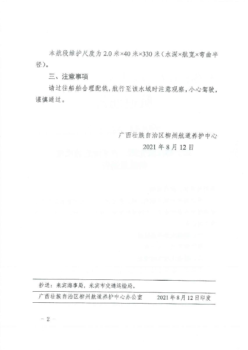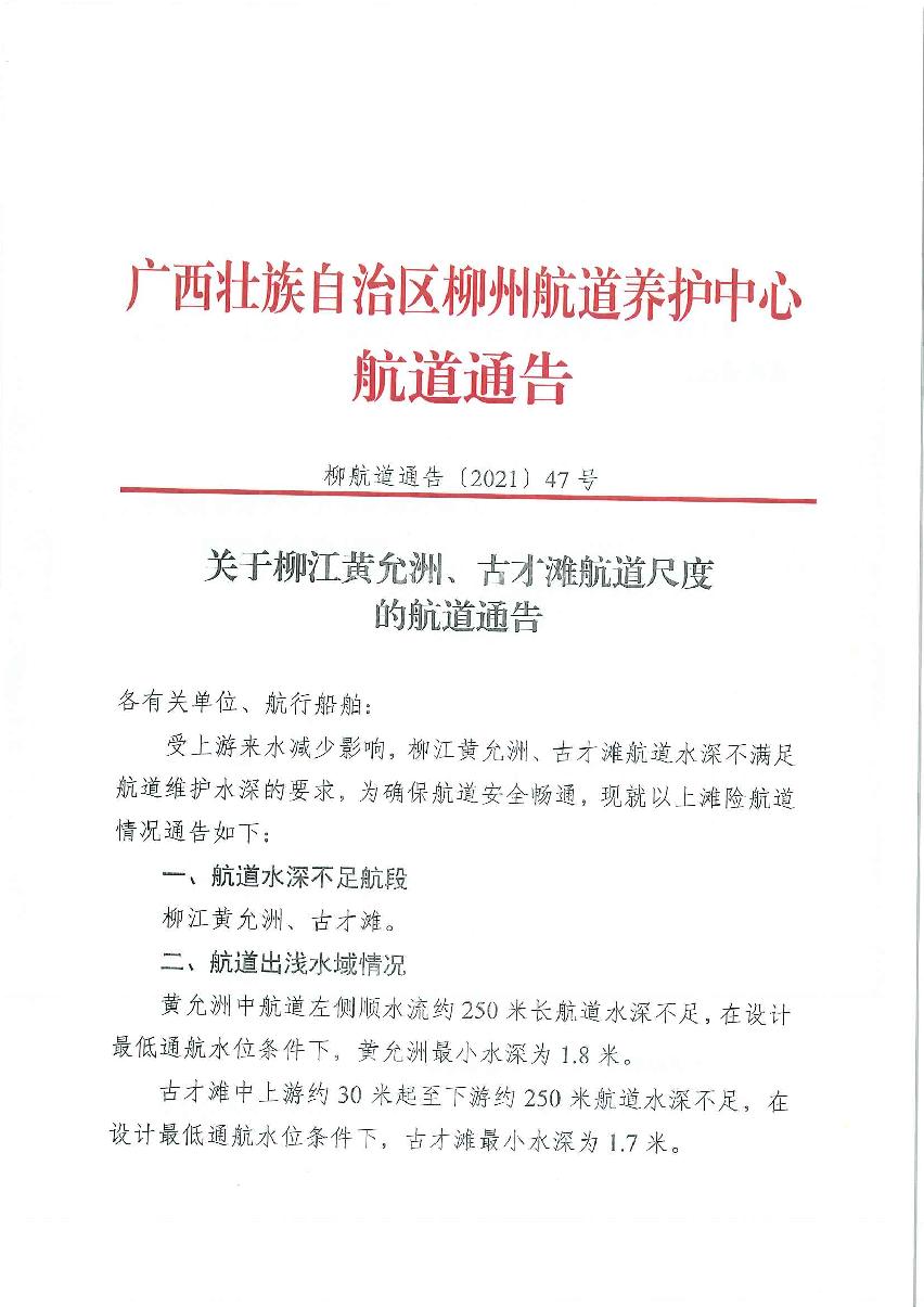关于柳江黄允洲、古才滩航道尺度的航道通告