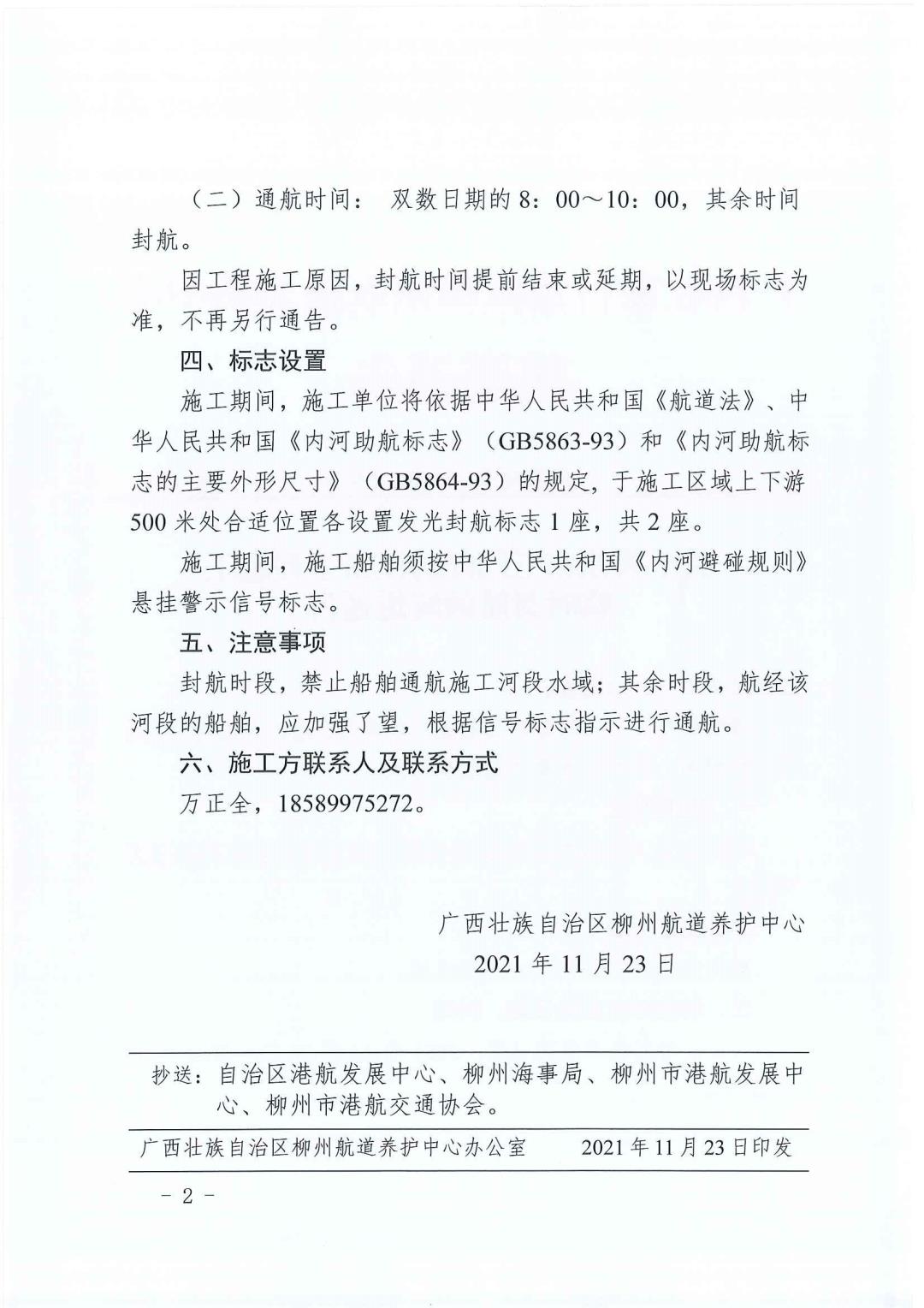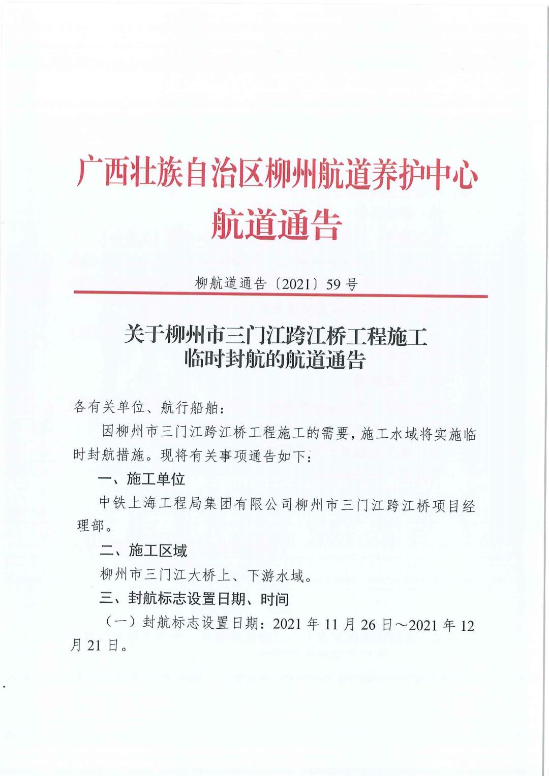 关于柳州市三门江跨江桥工程施工临时封航的航道通告