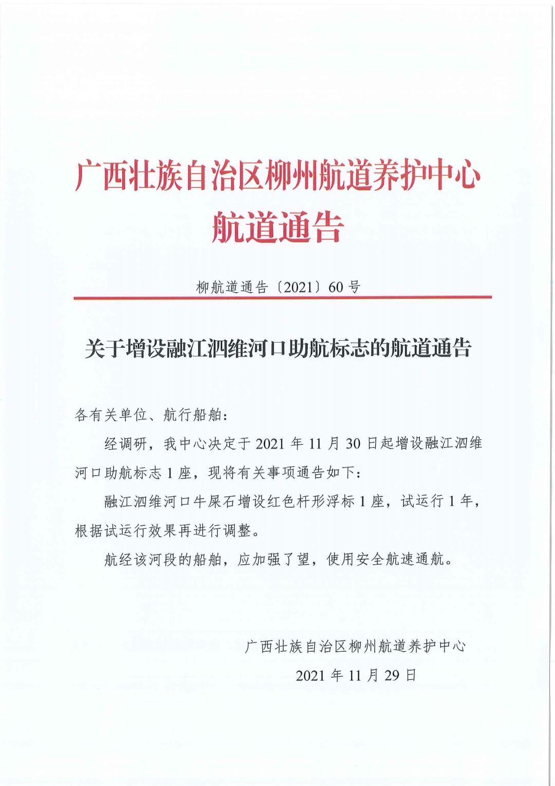 关于增设融江泗维河口助航标志的航道通告