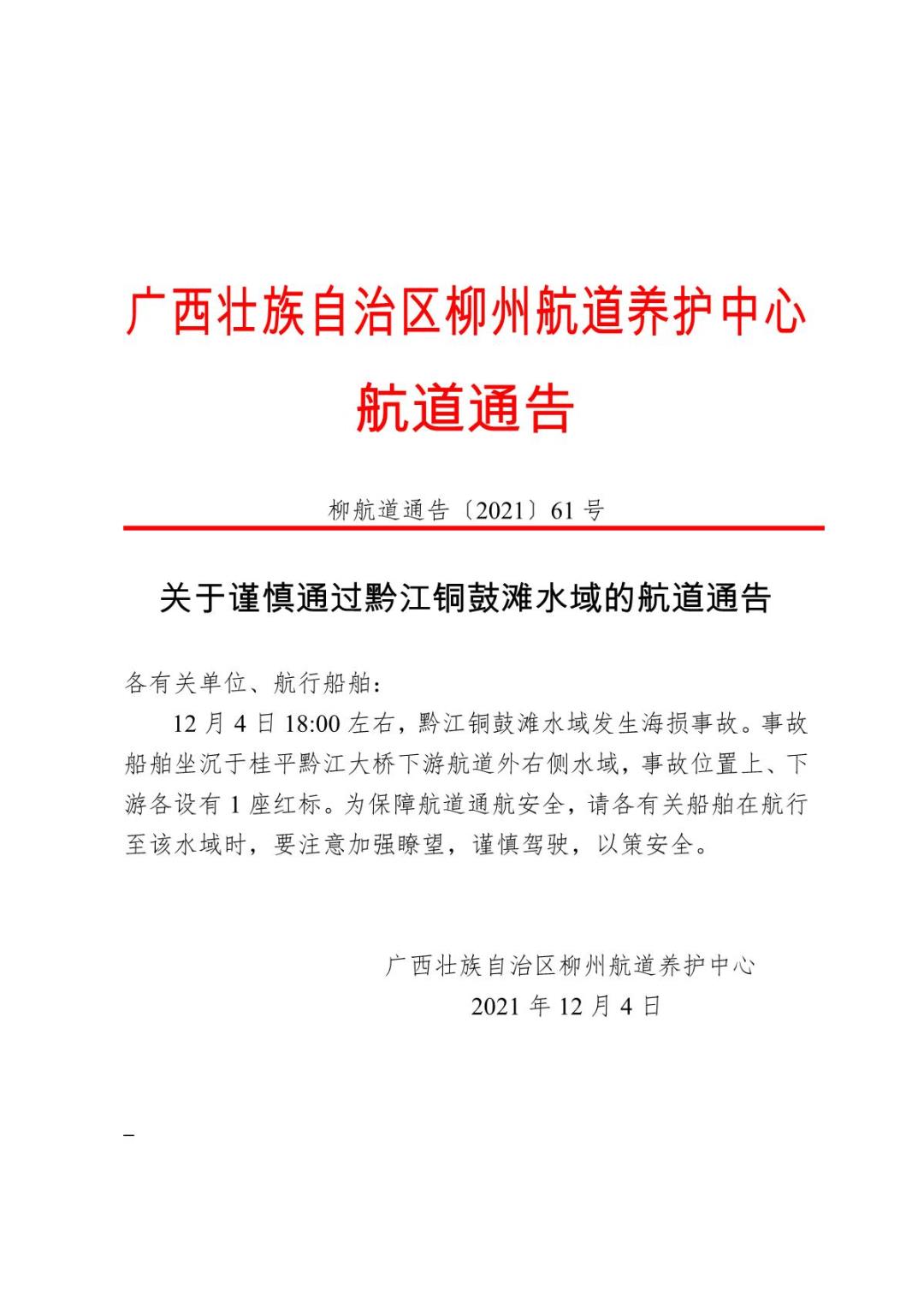 关于谨慎通过黔江铜鼓滩水域的航道通告