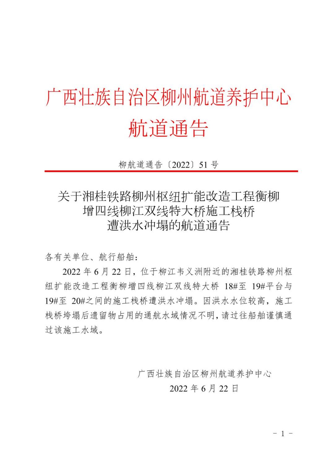 关于湘桂铁路柳州枢纽扩能改造工程衡柳增四线柳江双线特大桥施工栈桥遭洪水冲塌的航道通告