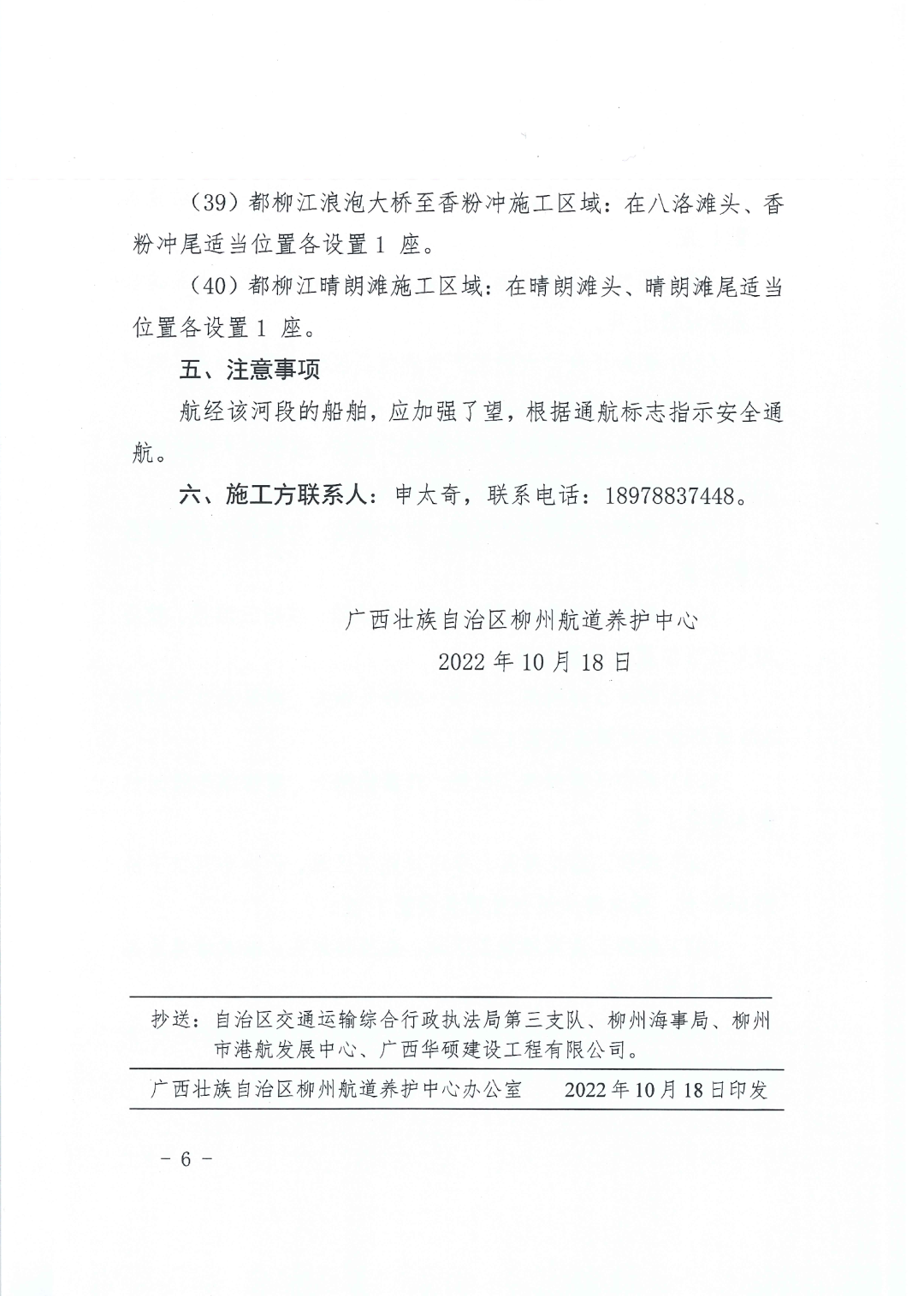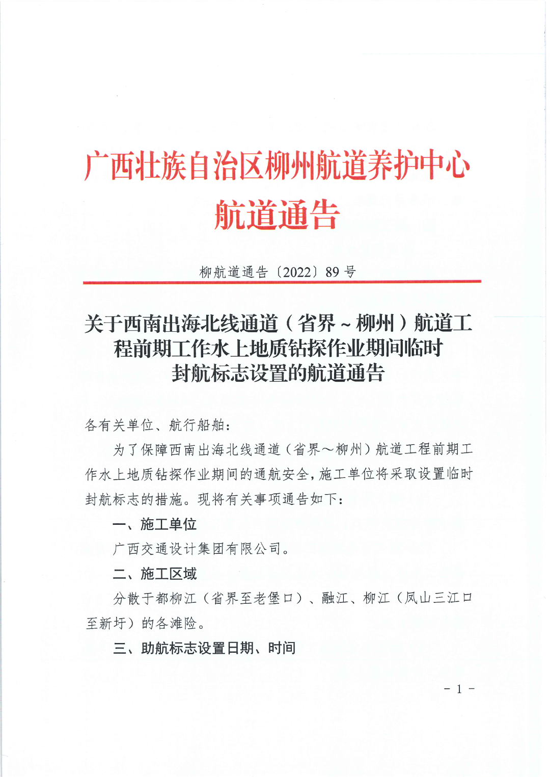 关于西南出海北线通道(省界~柳州)航道工程前期工作水上地质钻探作业期间临时封航标志设置的航道通告