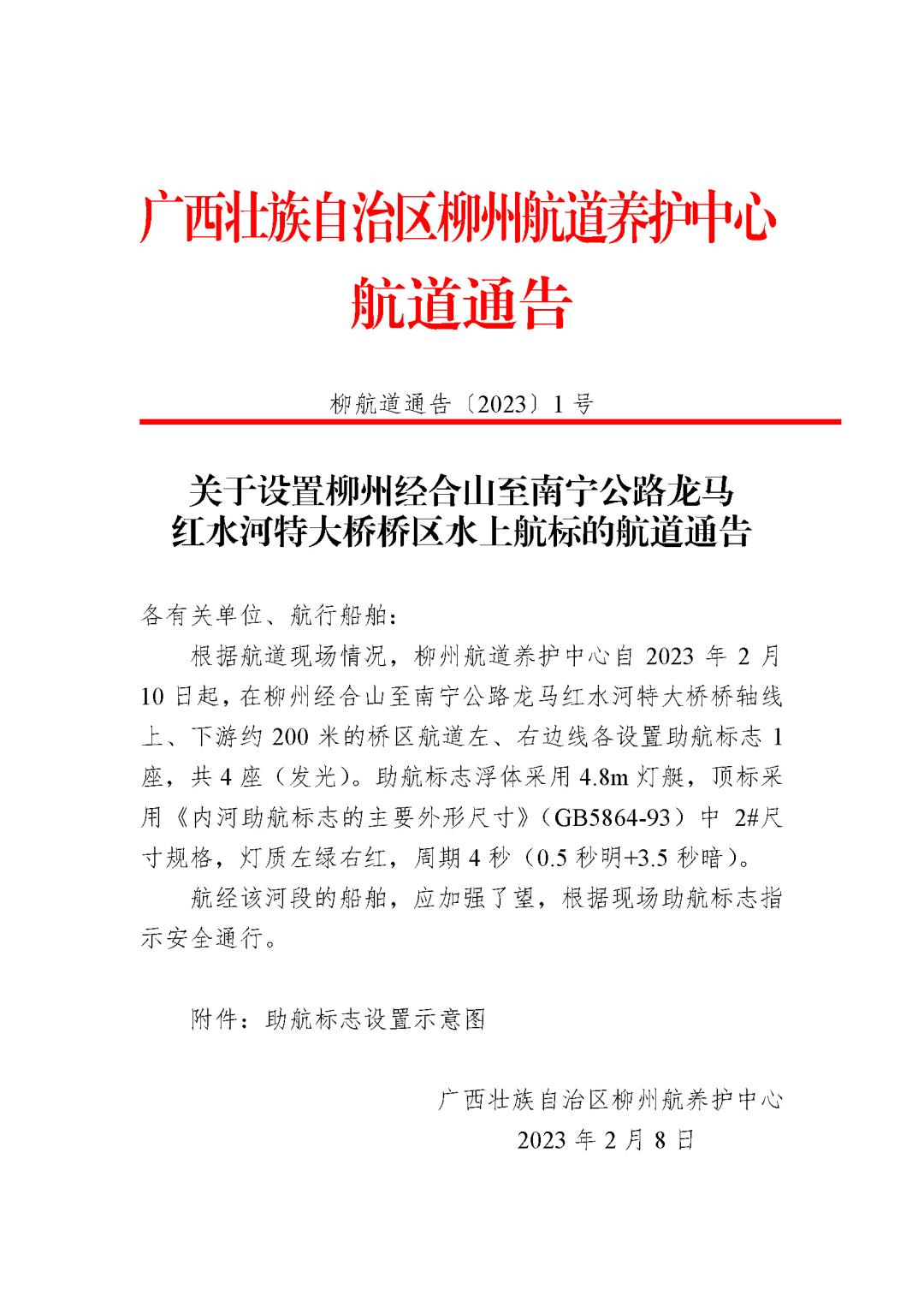 关于设置柳州经合山至南宁公路龙马红水河特大桥桥区水上航标的航道通告