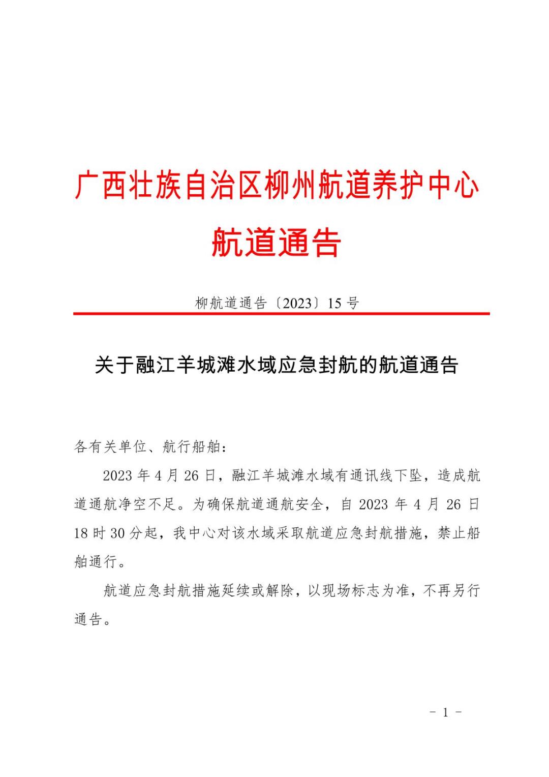 关于融江羊城滩水域应急封航的航道通告
