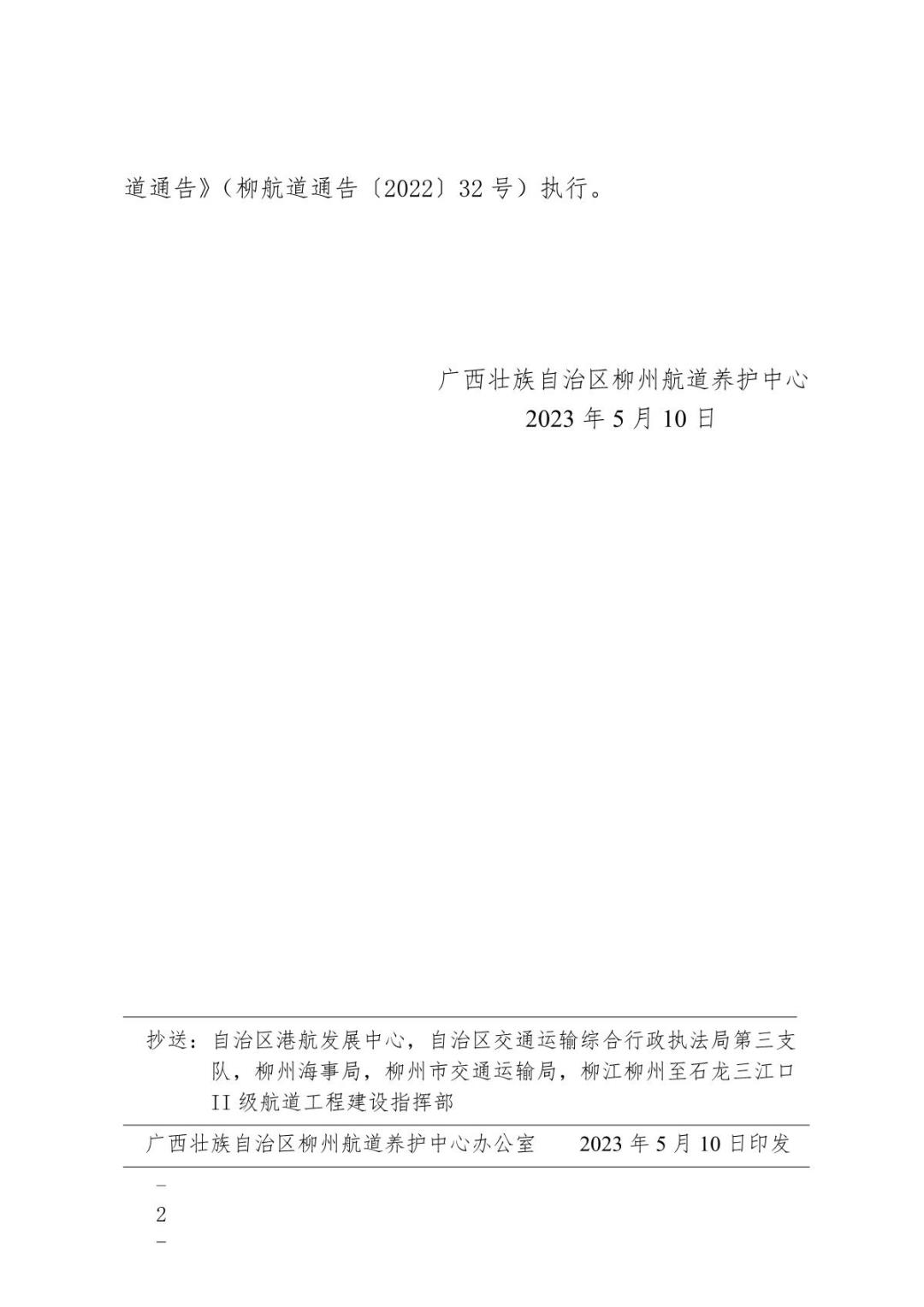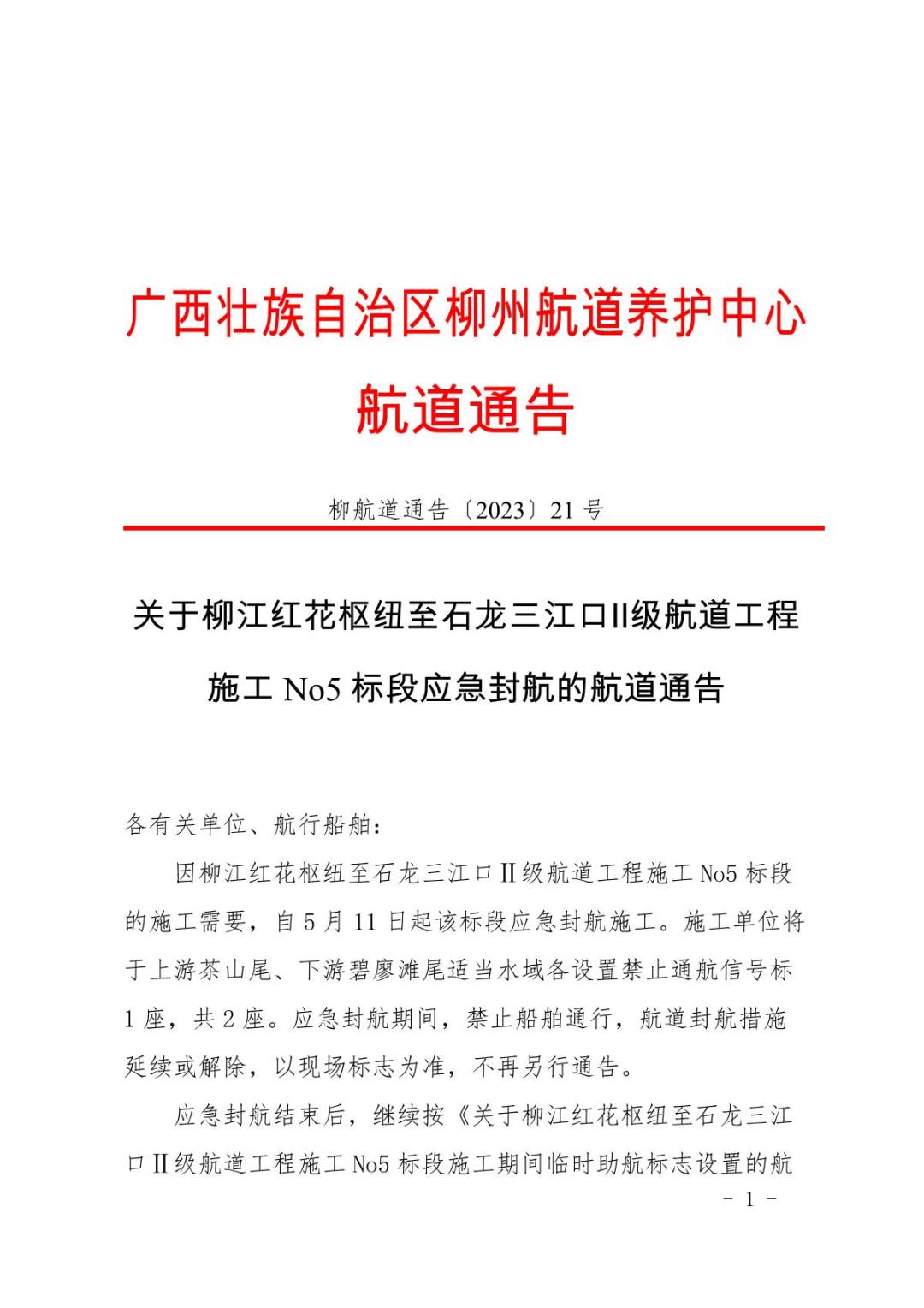关于柳江红花枢纽至石龙三江口Ⅱ级航道工程施工No5标段应急封航的航道通告