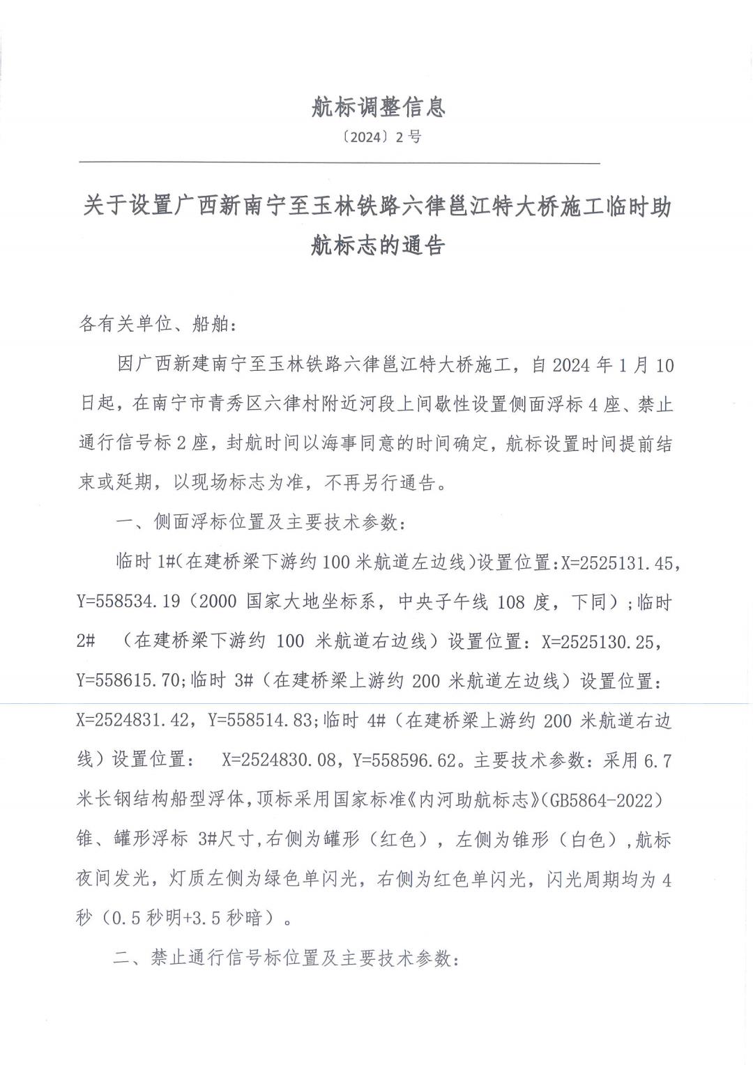 [2024]第2号关于设置广西新南宁至玉林铁路六律邕江特大桥施工临时助航标志的通告
