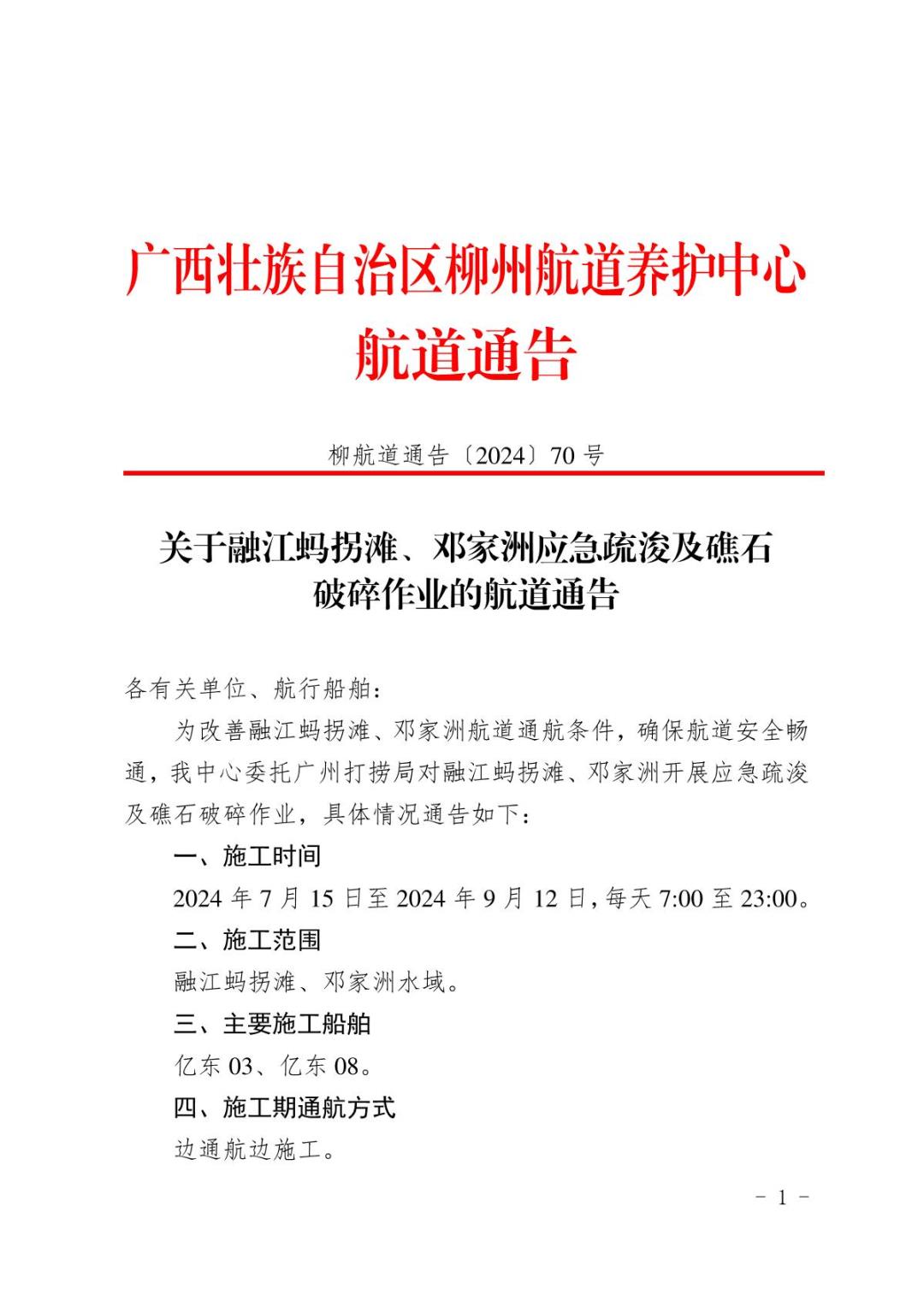 关于融江蚂拐滩、邓家洲应急疏浚及礁石破碎作业的航道通告