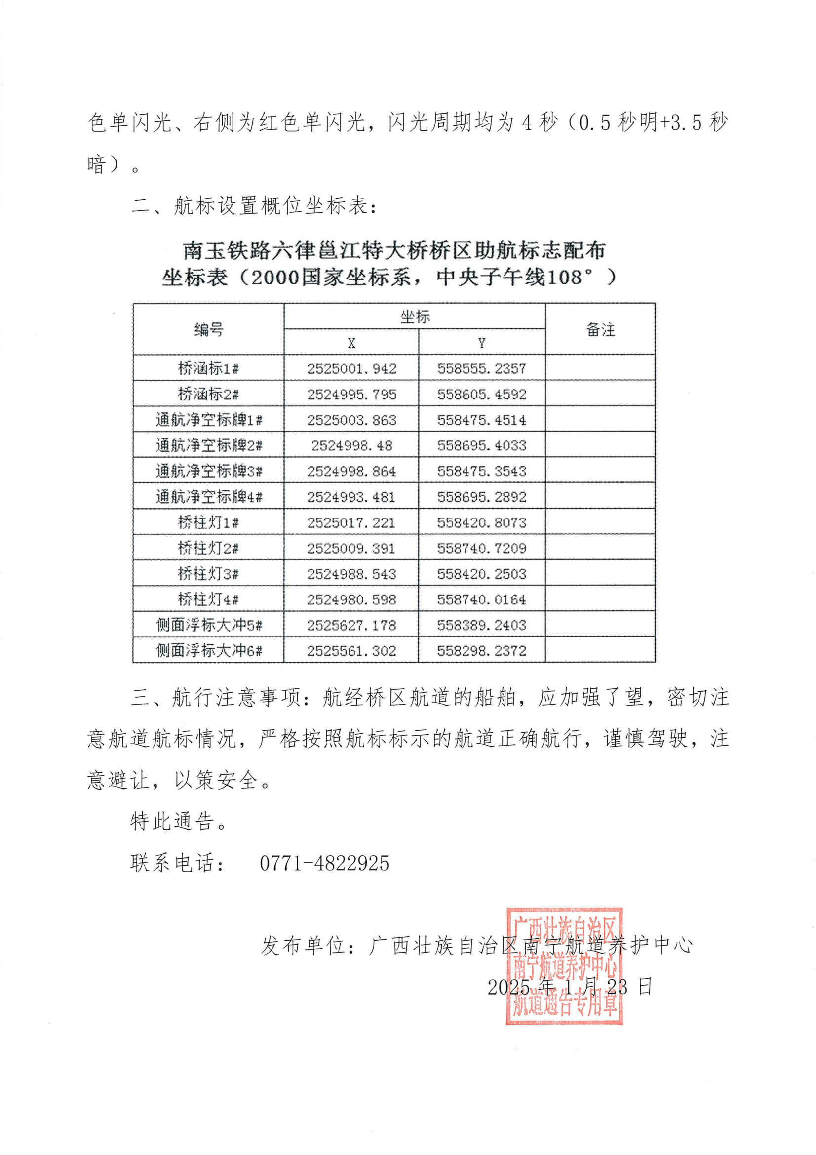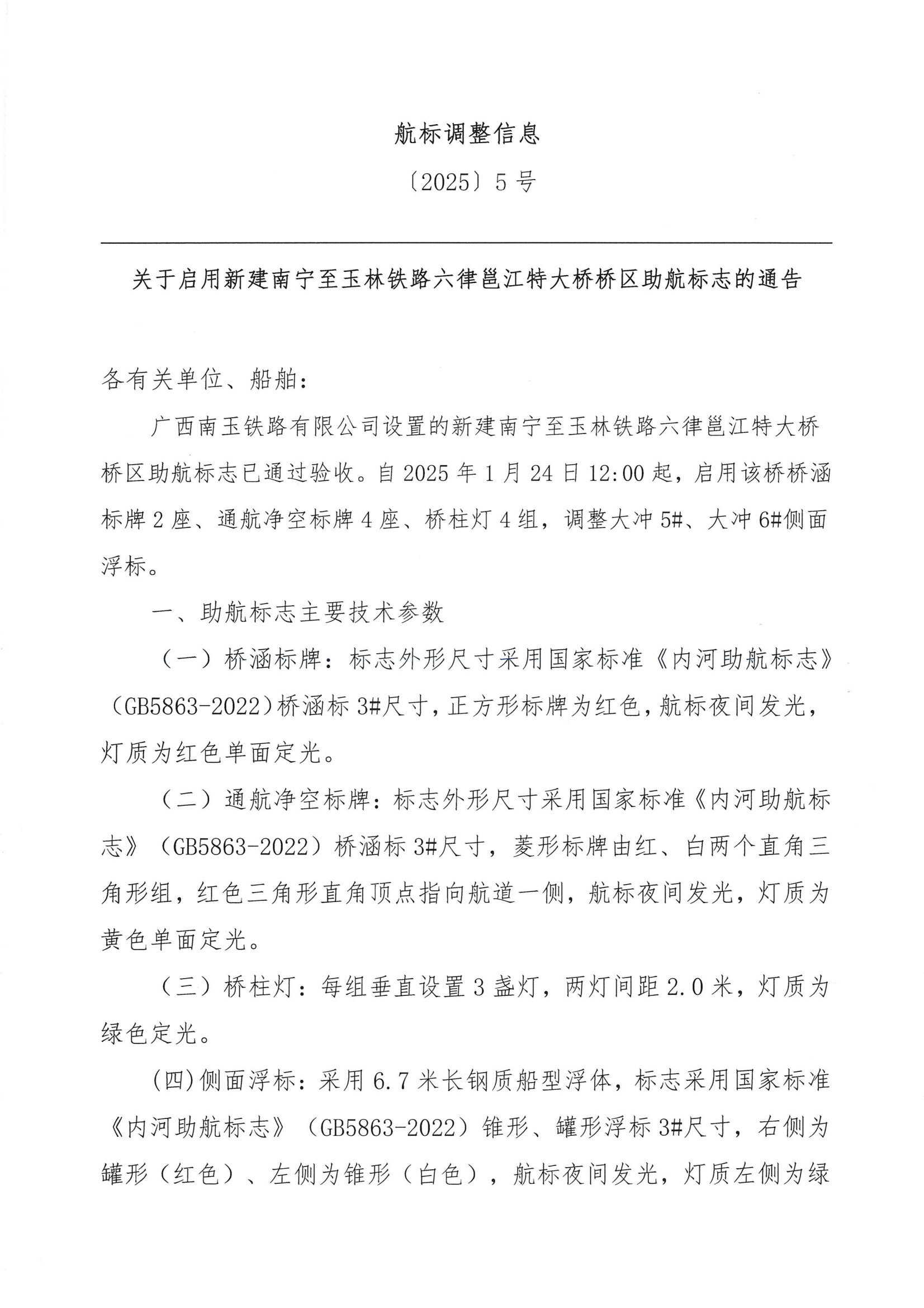 [2025]第5号关于启用新建南宁至玉林铁路六律邕江特大桥桥区助航标志的通告