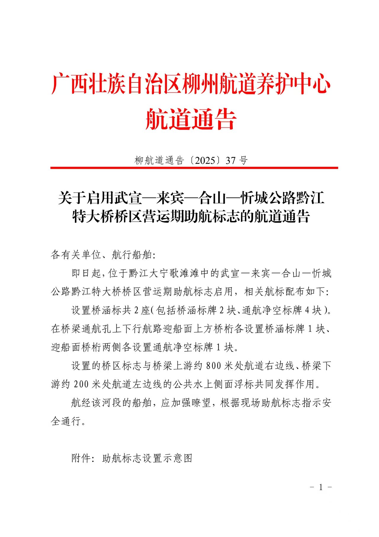 关于启用武宣—来宾—合山—忻城公路黔江特大桥桥区运营期助航标志的航道通告